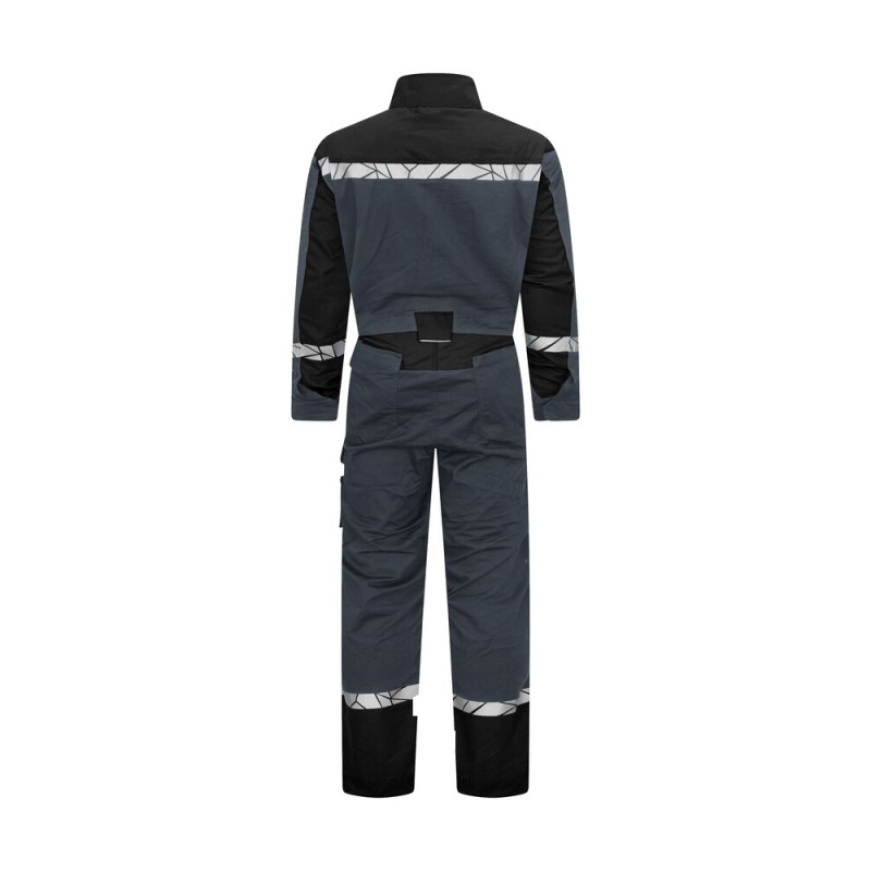 Combinaison avec fermeture à glissière double sens jusqu'au col à l'avant - Fermeture éclair YKK Natulon - La fermeture éclair avant est couverte d'un rabat avec fermeture à pression. Poche poitrine sur le côté droit avec support interne pour fixer la carte d'identité. Poches profondes sur les côtés, également des ouvertures pour accéder aux poches du pantalon sous la combinaison. Poches sur les jambes, côté gauche une poche spacieuse avec rabat et fermeture Velcro ainsi qu'une poche interne pour téléphone. Côté droit, poches pour stylos, papier et mètre pliant. Poches pour protections de genoux, ouverture extérieure avec fermeture éclair. Genoux préformés. Taille élastique. Poches arrière, poche gauche avec rabat et fermeture aimantée. Poignets ajustables avec Velcro. Poche à puce de lavage dans la couture latérale intérieure gauche.Testé pour le lavage industriel selon la norme ISO 15797.Visibilité améliorée selon EN 17353Fourni dans un sac biosourcé et compostable